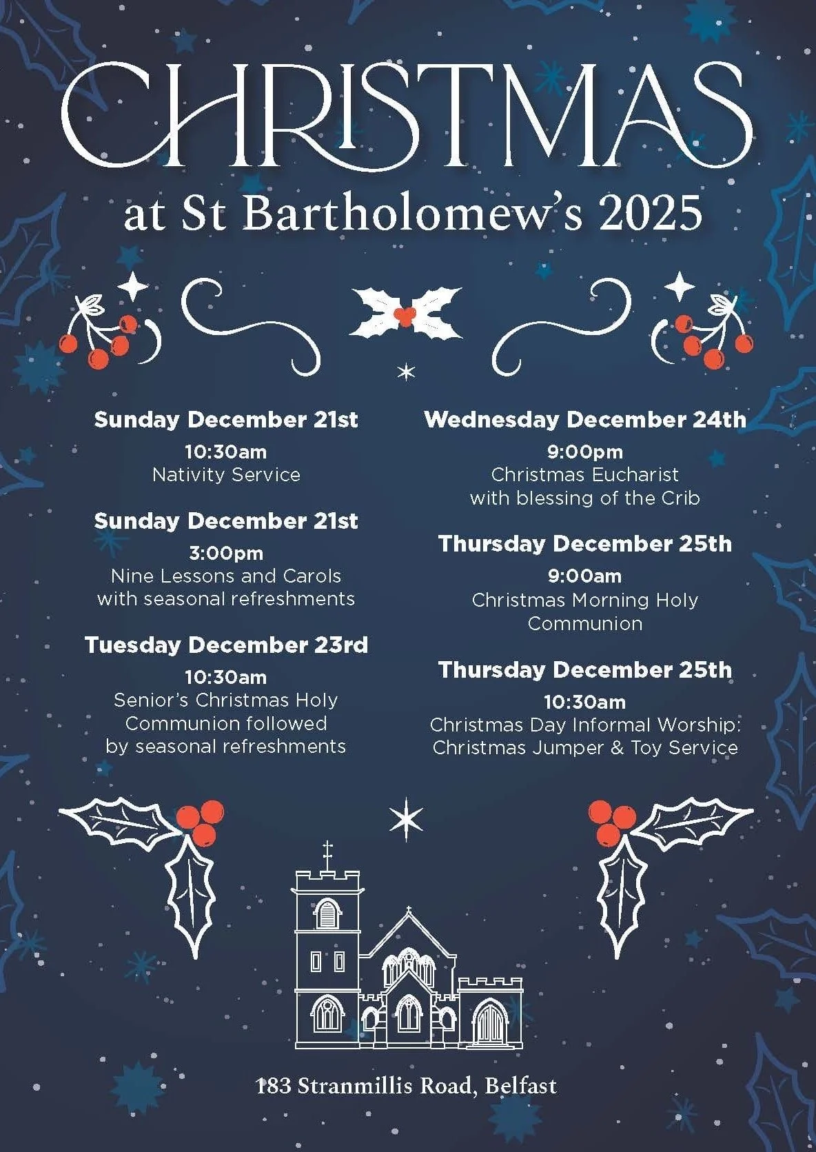 There’s something special about Christmas at St.Bartholomew’s, Stranmillis. It’s a beautiful time of year when we celebrate the birth of Jesus. It’s also a time to hear the Christmas story afresh through carols and readings. Please join with us to hear the message of Christmas once again and celebrate the birth of our Lord Jesus Christ.